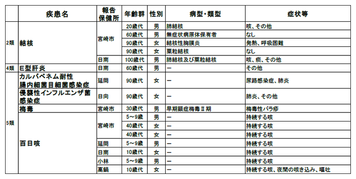 ○マイコプラズマ肺炎:報告数は4例(定点当たり0.6)で、高鍋(2例)、宮崎市(1例)、日南(1例)保健所から報告があった。年齢は0〜4歳が2例、5〜9歳が1例、10〜14歳が1例であった。