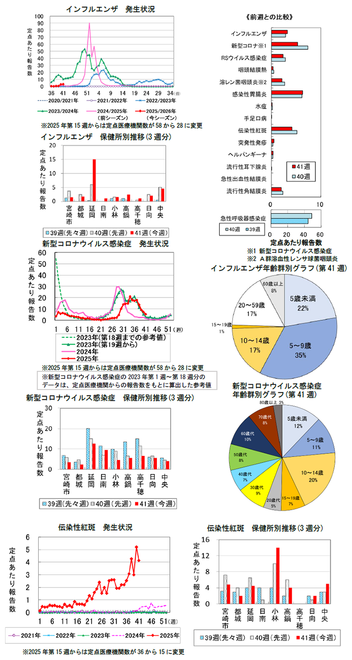 ・第41週の定点医療機関からの報告総数(急性呼吸器感染症除く)は501人(定点当たり27.5)で、前週比89%と減少した。なお、前週に比べ増加した主な疾患はインフルエンザで、減少した主な疾患は新型コロナウイルス感染症、RSウイルス感染症、A群溶血性レンサ球菌咽頭炎及び伝染性紅斑であった。また、第40週の急性呼吸器感染症の報告総数は1,368人(定点当たり48.9)で、前週比110%と増加した。