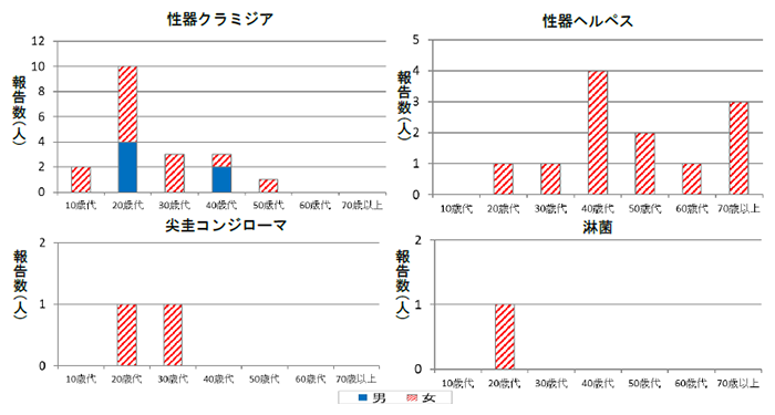 定点医療機関からの報告総数は4,993人(5.1)で、前月比110%と増加した。疾患別報告数は、性器クラミジア感染症2,691人(2.7)で前月比111%、性器ヘルペスウイルス感染症954人(0.97)で前月比112%、尖圭コンジローマ532人(0.54)で前月比100%、淋菌感染症816人(0.83)で前月比109%であった。