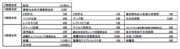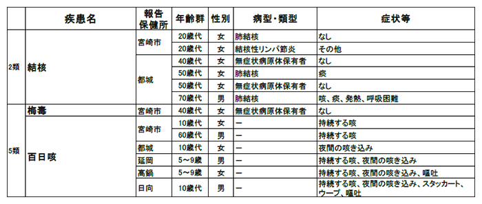 ○マイコプラズマ肺炎:報告数は5例(定点当たり0.71)で、鍋(3例)、宮崎市(2例)保健所から報告があった。年齢は0〜4歳が2例、5〜9歳が2例、10〜14歳が1例であった。