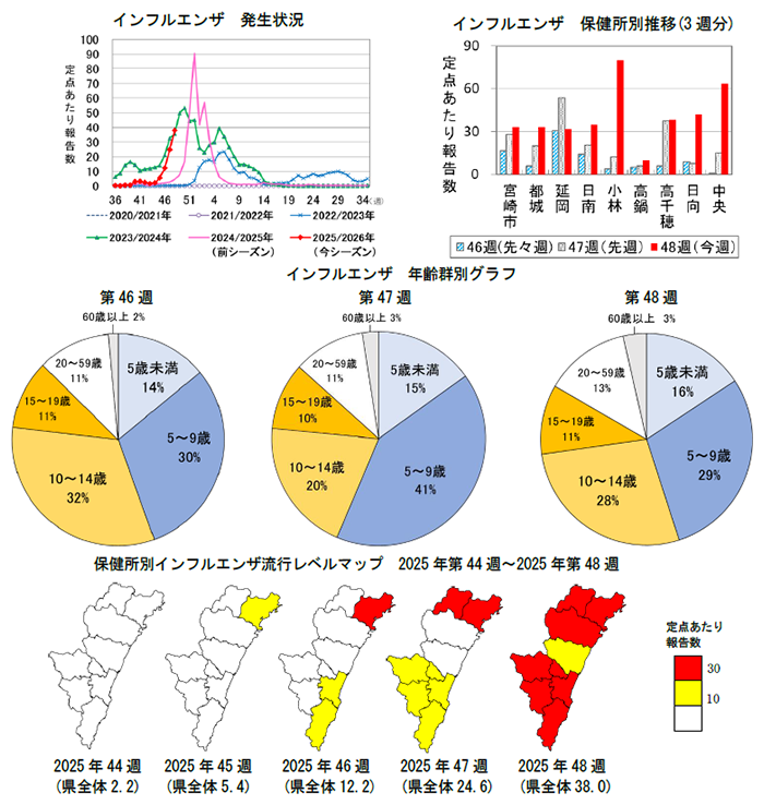 インフルエンザの報告数が前週の約1.5倍、1,064人(定点当たり報告数38.0)となり、今シーズン初めて流行警報レベル開始基準値(30)を超えた。昨シーズンよりも3週間早くなっており、県内全ての保健所管内で、流行警報レベル開始基準値(30)又は流行注意報レベル基準値(10)以上である。詳細後述。