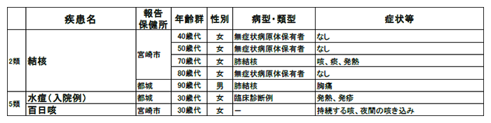 ○マイコプラズマ肺炎:報告数は2例(定点当たり0.29)で、宮崎市(1例)、日向(1例)保健所から報告があった。年齢は5〜9歳が1例、10〜14歳が1例であった。