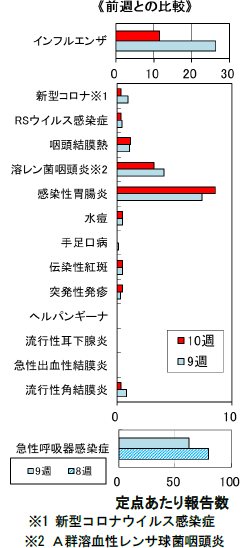 また、第9週の急性呼吸器感染症の報告総数は1,738人(定点当たり62.1)で、前週比78%と減少した。