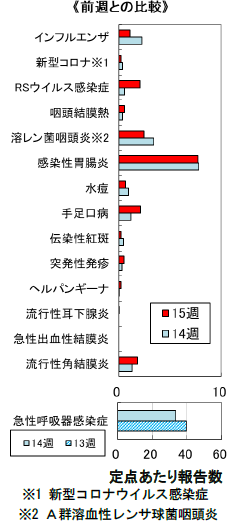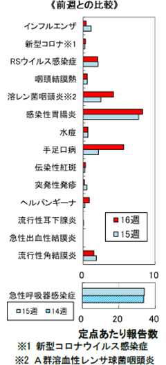 ・定点医療機関からの報告総数は374人(定点当たり25.3)で、前週比127%と増加した。なお、前週に比べ増加した疾患はA群溶血性レンサ球菌咽頭炎、感染性胃腸炎、手足口病で、減少した主な疾患はインフルエンザであった。また、第15週の急性呼吸器感染症の報告総数は949人(定点当たり33.9)で、前週比101%とほぼ横ばいであった。