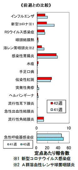 また、第41週の急性呼吸器感染症の報告総数は1,266人(定点当たり45.2)で、前週比93%と減少した。