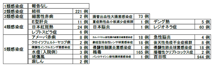 - 4類感染症:重症熱性血小板減少症候群1例、日本紅斑熱1例。