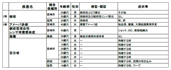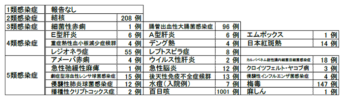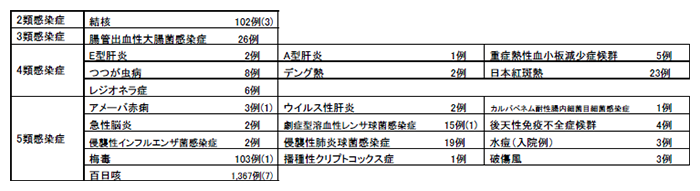 - 5類感染症:アメーバ赤痢1例、劇症型溶血性レンサ球菌感染症1例、梅毒1例、百日咳7例。