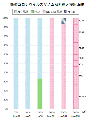 ○第34-38 週はPQ系統を含むNB.1.8.1系統が100%であった。(NB.1.8.1は27%、PQ系統は74%)※端数処理の関係で、内訳の和が100%になりません。