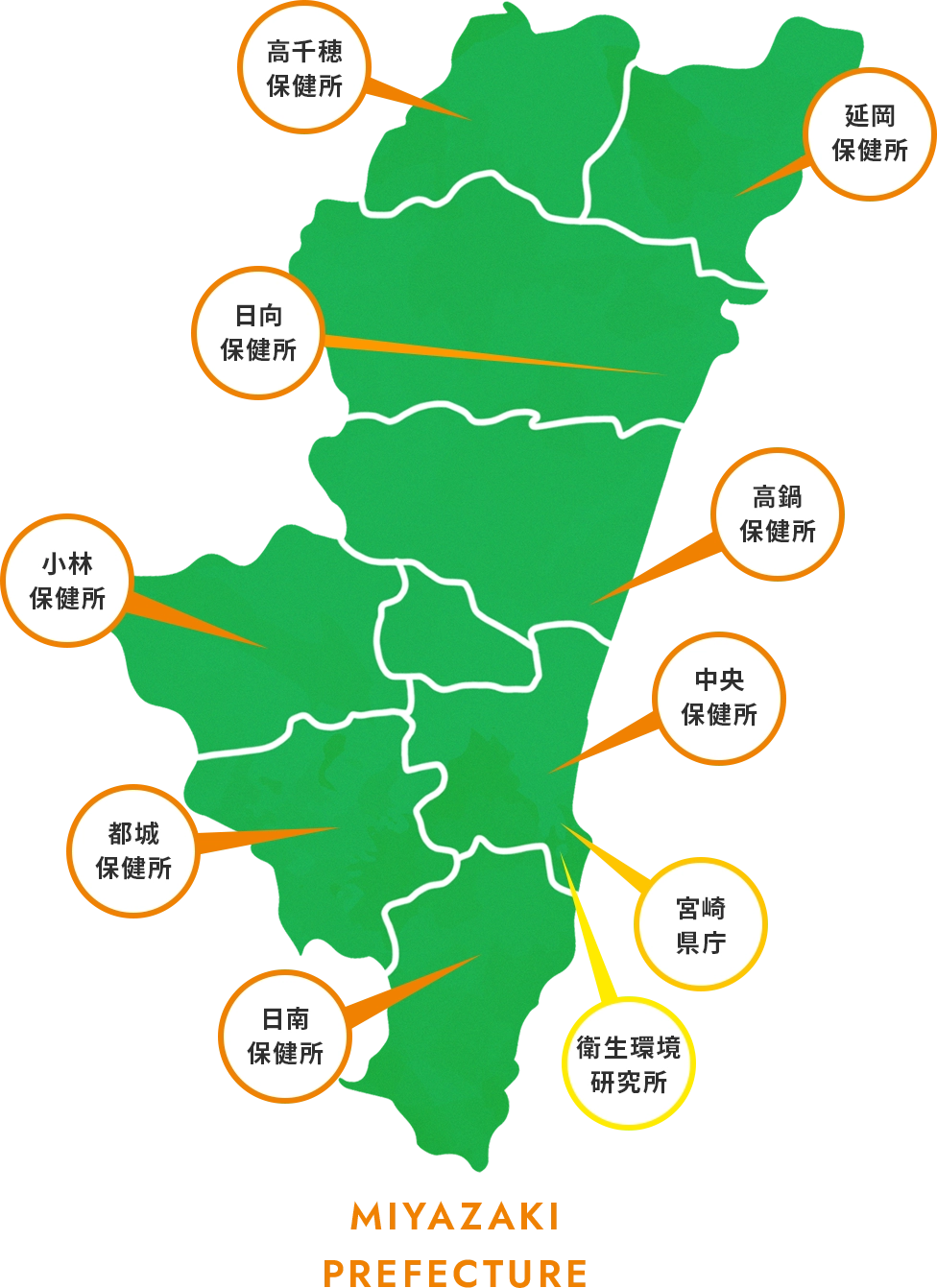 主な勤務先は県内8つの県保健所、本庁、衛生環境研究所です。