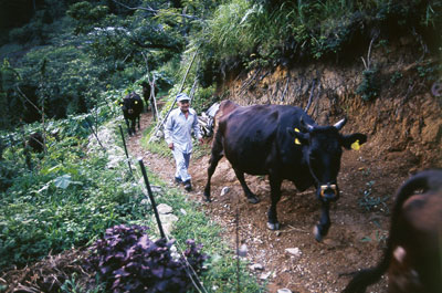 椎葉村松木地区。村道から屋敷へ続く坂道を石垣添いに登ると、苔に覆われた大きな水舟が目に入る。幹回りがふた抱えもありそうな松の木を半割にして、中をくり抜き水槽にしたものだ。那須久喜さん(69)が蜂蜜一升と交換して手に入れた松である。透き通った山の湧き水がホースから流れ込み、麦茶がペットボトルに入れて冷やしてあった。 久喜さんと妻の久子さん(63)は翌日、村内で牛の品評会が行われるというので、出品する去勢牛の手入れに余念がない。