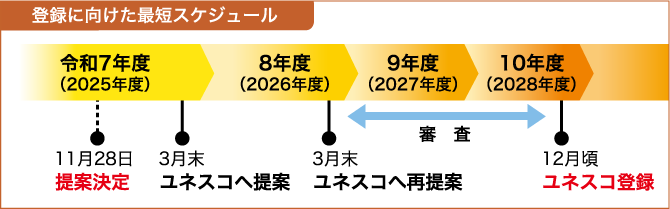 今後、ユネスコ(国際連合教育科学文化機関)に提案書が提出され、政府間委員会の審議などを経て、早ければ令和10年に登録される見込みです。