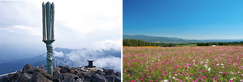 写真左)天の逆鉾/高千穂峰の山頂に立つ天の逆鉾は、ニニギノミコトが降臨したときに峰に突き立てたとされる伝説によるもので、山岳信仰の舞台となった。 写真右)生駒高原/小林市からえびの高原に向かう途中に広がる標高500mの高原。春は35万本の菜の花と15万本のアイスランドポピー、秋は100万本のコスモスが埋め尽くす。