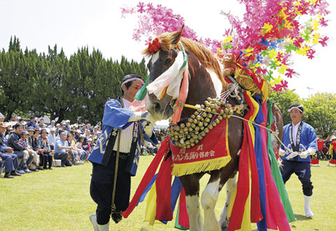 三股町の早馬神社は、かつて耕作の大切な担い手だった牛馬を守護する馬頭観音を祭る神社。その大祭である早馬まつりでは、美しく飾った馬が三味線や太鼓のリズムの合わせて踊るジャンカン馬踊りや棒踊り、俵踊りなどの郷土芸能が奉納される。