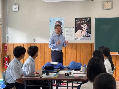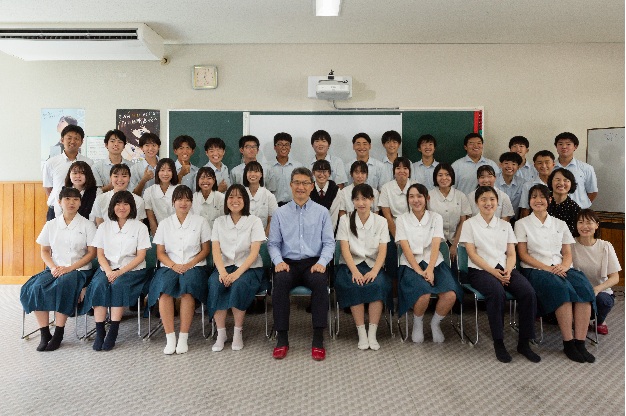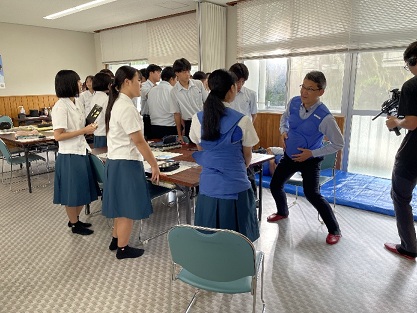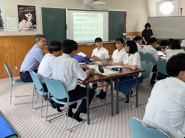知事は自身が経験した子育ての大変さや喜びなど、生徒たちと意見交換を行い、生徒からは「靴下を脱いだり、履いたりするのが大変だった。」、「妊婦さんの負担を知り、将来積極的にサポートしたいと思った。」などの感想が聞かれ、「とも家事」への理解を深めていました。