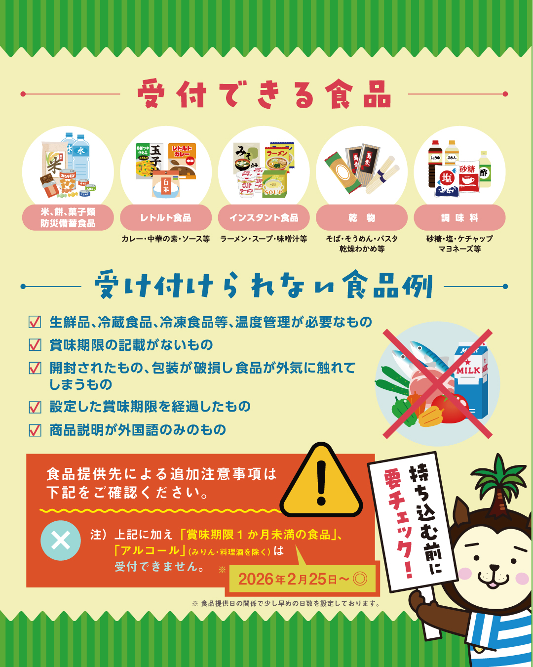 会場によって受け付け可能な食品が異なるため、受付可能食品等を事前にご確認の上、ぜひご協力をお願いいたします。