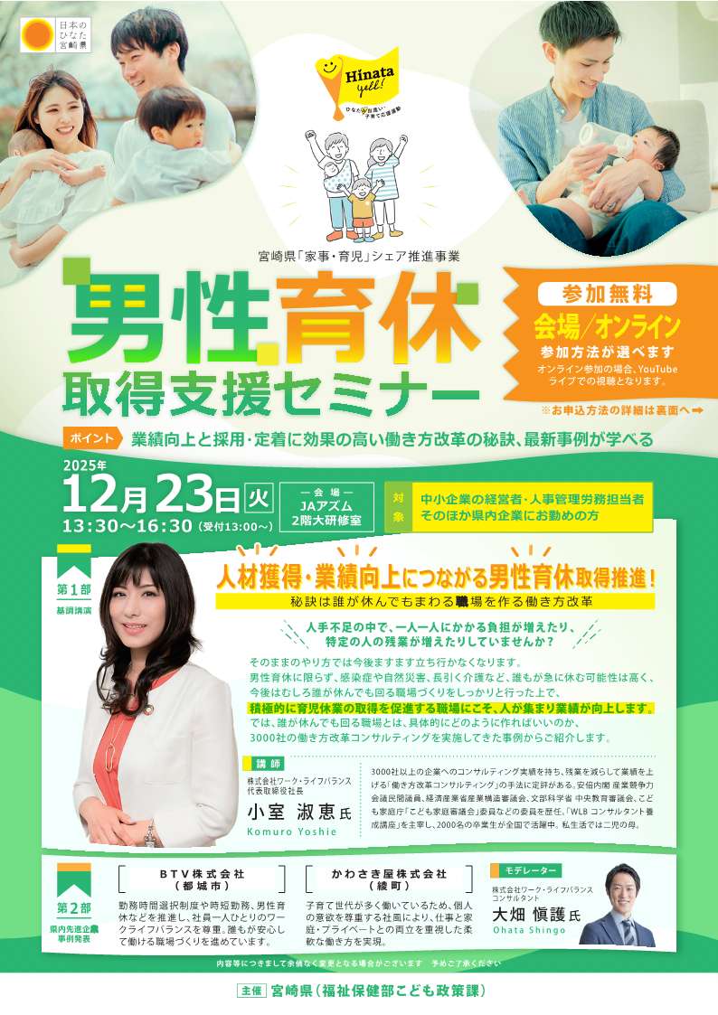 トップ > 教育・子育て > こども・子育て・青少年 > 子育て支援事業 > \参加料無料/男性育休取得支援セミナーを開催します