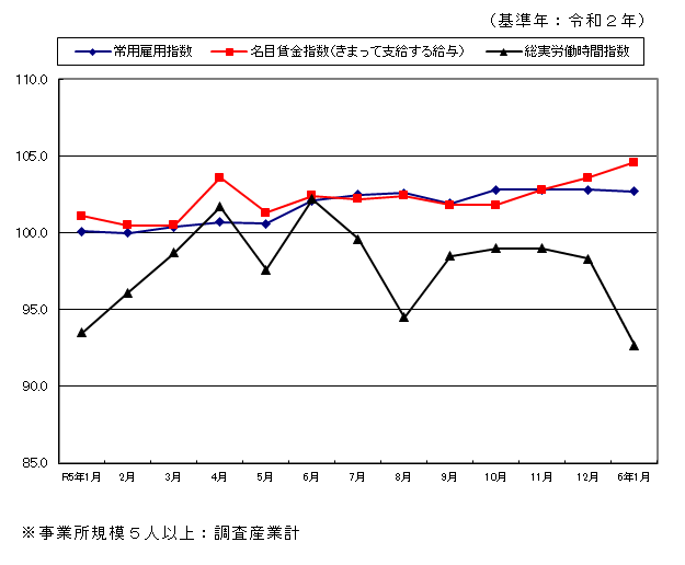 宮崎県における令和6年1月の賃金、労働時間及び雇用に関する調査結果(調査産業計)は、以下のとおりです。