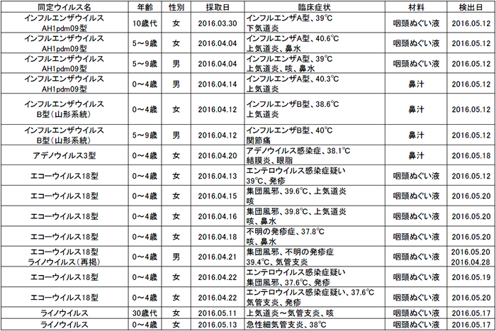 病原体検出情報(衛生環境研究所微生物部 平成28年5月23日までに検出)