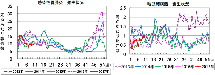 2017年2月27日〜3月5日までの1週間で67,273人(13.6)で前週比80%と減少した。長ア県(21.4)、石川県(21.0)、沖縄県(20.4)からの報告が多い。年齢別では5歳未満が全体の20%、5-9歳が29%、10-14歳が16%、15-19歳が5%、20-59歳が21%、60歳以上が9%であった。