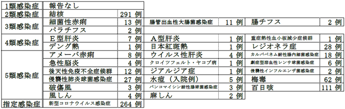 - 5 類感染症:アメーバ赤痢1 例、カルバペネム耐性腸内細菌感染症1 例、後天性免疫不全症候群1 例、侵襲性肺炎球菌感染症1 例、水痘(入院例)1 例、百日咳1 例。