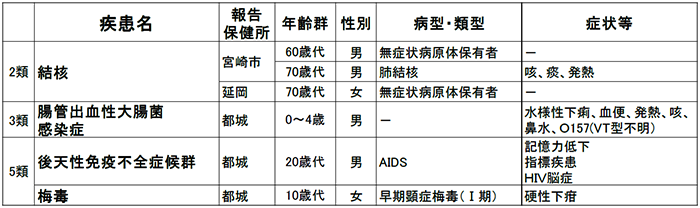 新型コロナウイルス感染症(指定感染症)の報告が47例あった。第29週目までの届出は20例であり、届出総数は67例となった。47例の中には、高鍋保健所管内で発生した新型コロナウイルス感染症のクラスター(感染集団)が含まれている。