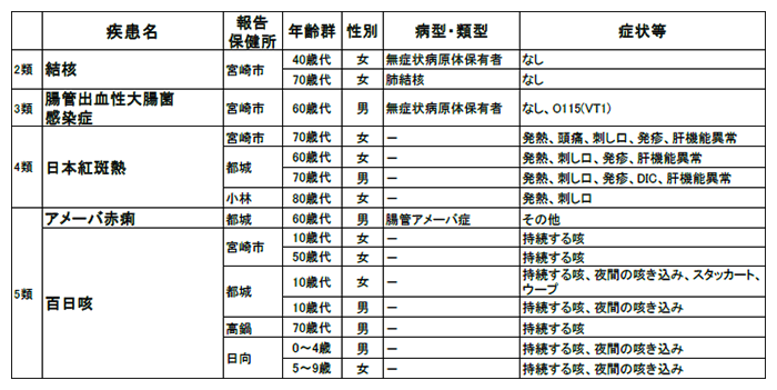 ○マイコプラズマ肺炎:報告数は5例(定点当たり0.7)で、宮崎市(3例)、延岡(1例)、高鍋(1例)保健所から報告があった。年齢は0〜4歳が2例、10〜14歳が2例、5〜9歳が1例であった。