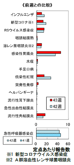 ・第43週の定点医療機関からの報告総数(急性呼吸器感染症除く)は350人(定点当たり22.2)で、前週比98%とほぼ横ばいであった。なお、前週に比べ増加した主な疾患は感染性胃腸炎で、減少した主な疾患はインフルエンザ、新型コロナウイルス感染症、伝染性紅斑であった。また、第42週の急性呼吸器感染症の報告総数は1,195人(定点当たり42.7)で、前週比94%と減少した。