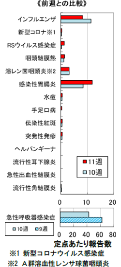 また、第10週の急性呼吸器感染症の報告総数は1,186人(定点当たり42.4)で、前週比68%と減少した。