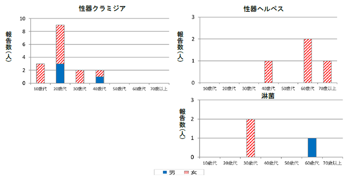 - 性器クラミジア感染症:報告数16人(1.2)で、前月の約0.6倍、昨年2月の約0.7倍であった。20歳代が全体の約6割を占めた。(男性4人・女性12人)