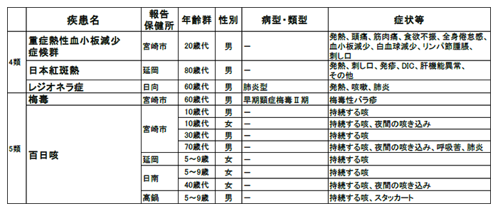 ○マイコプラズマ肺炎:報告数は2例(定点当たり0.3)で、延岡(1例)、高鍋(1例)保健所から報告があった。年齢は5〜9歳が1例、10〜14歳が1例であった。