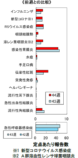 また、第43週の急性呼吸器感染症の報告総数は1,296人(定点当たり46.3)で、前週比108%と増加した。