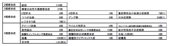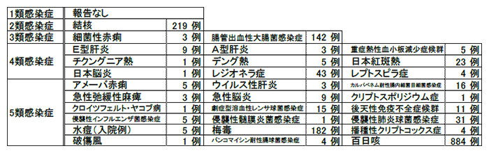 - 4類感染症:重症熱性血小板減少症候群1例、日本紅斑熱1例、レジオネラ症1例。