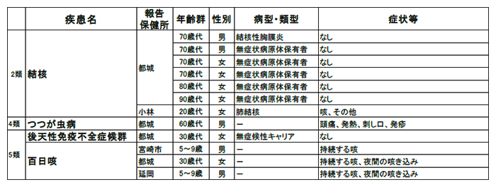 ○感染性胃腸炎(ロタウイルス):報告数は1例(定点当たり0.14)で、高鍋保健所から報告があった。年齢は5〜9歳であった。