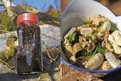 ハチの子の炒め物はおかずにも肴にも向く。ハチの子は塩漬けにして保存する人も。