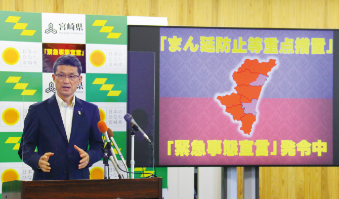 それでも8月中旬以降、宮崎市を中心にクラスター(感染者集団)が続発し、感染急拡大に歯止めがかからず、1日の感染者数が100人を超える日が続きました。医療提供体制のひっ迫が懸念される厳しい状況の中、より強い対策が必要と考え、国に「まん延防止等重点措置」を要請。8月27日から本県に初めて適用されました。