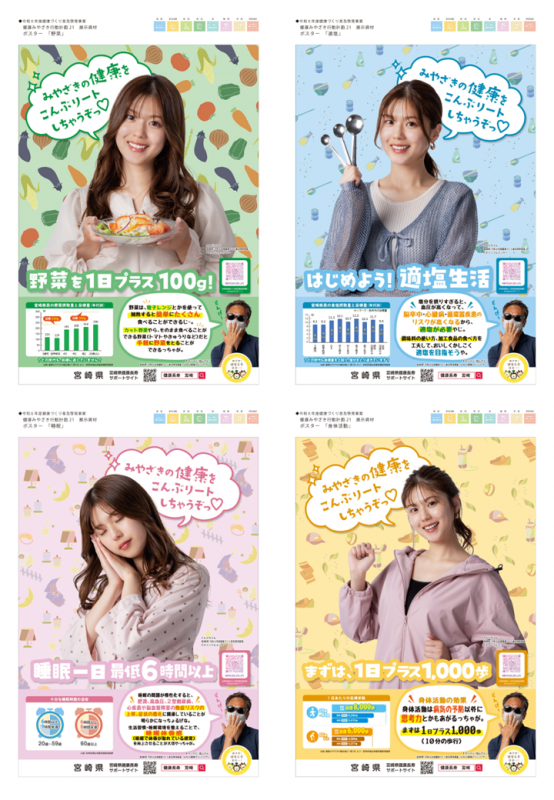 県健康増進課では、毎年健康づくりを普及啓発するためのポスターを作成しています。今年度は、tiktokやインスタグラムで活躍されている「こんぶちゃん」をモデルに起用しポスターを作成しました。ポスターの種類は8種類で、健康寿命を延ばすために大切な8つの項目(野菜、適塩、睡眠、運動、喫煙、飲酒、がん検診、歯・口腔)それぞれについて啓発する内容となっています。