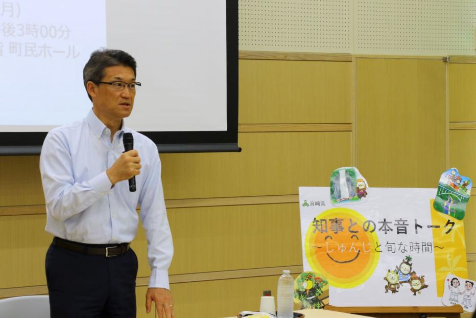 - 本日は、限られた時間ではあるが、皆さまからざっくばらんに質問、意見をお聞きしたいと思う。日之影町、そして宮崎全体の将来について考える実りある時間にしたい。