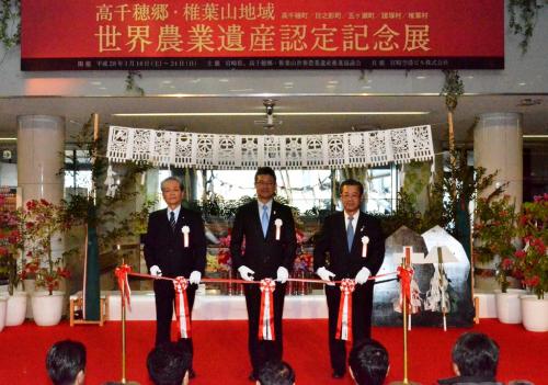 高千穂郷・椎葉山地域の世界農業遺産認定記念展が宮崎ブーゲンビリア空港オアシス広場で始まり、オープニングセレモニーに河野知事ら関係者が出席しました。