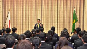 新規採用者一人一人の名前が読み上げられた後、代表者の國場美沙紀さんが河野知事の前で宣誓を行いました。知事からは「初心を忘れず、県政を前に進める力になってほしい」と激励がありました。