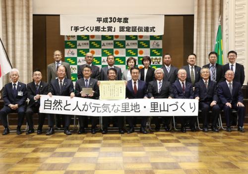 昨年11月に、地域づくりの優れた取組を表彰する「手づくり郷土賞」を受賞した地域への国土交通大臣認定証の伝達式が県庁で行われ、国土交通省九州地方整備局長から延岡市の「川坂川を守る会」に認定賞が、「宮崎県」に記念盾が授与されました。