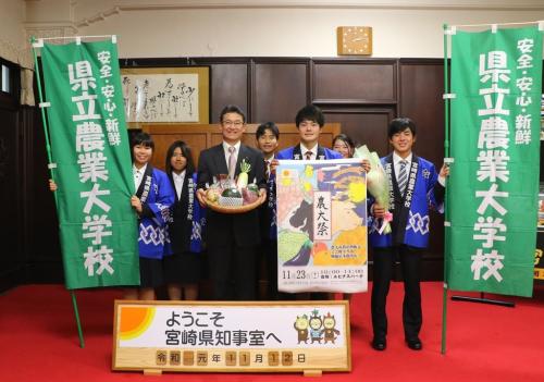 11月23日に開催する「第35回農大祭」をPRするため、県立農業大学校の学生が、河野知事を表敬訪問し、農大祭で販売する農産物や農産加工品を贈呈しました。