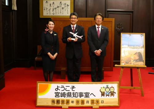 トップ > 県政情報 > 広報・広聴 > 知事室 > フォトギャラリー > バックナンバー > 2022年一覧 > 2022年3月一覧 > 日本航空株式会社による「デトックス・トリップ宮崎」PRの取り組み報告にかかる知事表敬