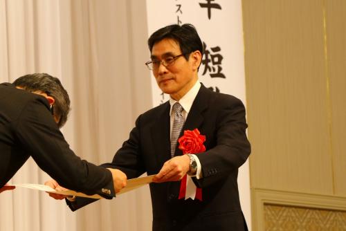 授賞式では、受賞者の奥田亡羊氏(受賞作品:歌集『花』)に対し、河野知事から賞状とトロフィーが贈られました。