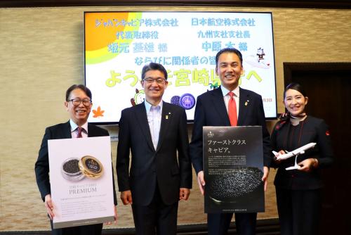 ジャパンキャビア株式会社が販売するキャビアがJAL国際線で採用されたことを受け、同社と日本航空株式会社の皆さまが河野知事を表敬しました。