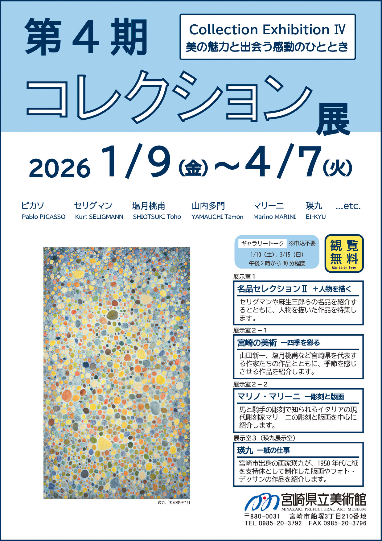 県立美術館では、第4期コレクション展を好評開催中です。国内外の名品や郷土作家の代表作とともに、ルオー、児島虎次郎(こじまとらじろう)などの人物画、益田玉城(ますだぎょくじょう)らによる四季を描いた作品を紹介しています。また、イタリアの彫刻家マリーニの作品や、瑛九(えいきゅう)が手がけた版画や写真といった紙の作品なども展示しています。観覧は無料です。美術館を目的にお越しいただくのはもちろん、公園での散歩や図書館、コンサートなどの機会に、気軽にお立ち寄りください。