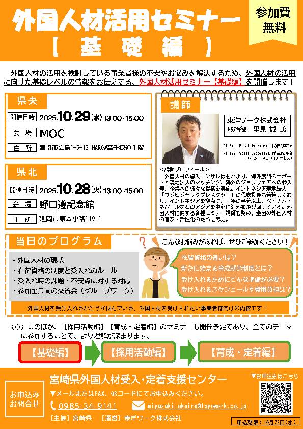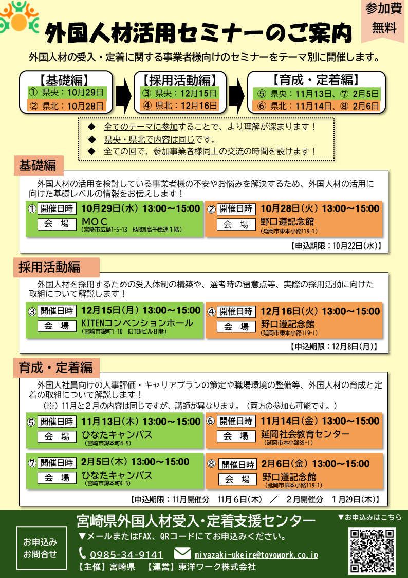 宮崎県では、外国人材の受入・定着に関する事業者様向けのセミナーをテーマ別に開催します。
