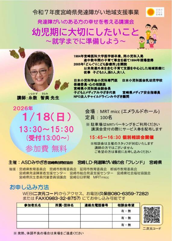 講演会終了後に、主催のASDみやざき、宮崎LD・発達障がい親の会「フレンド」による相談会も開催されます。