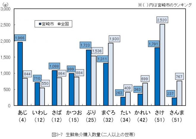 宮崎市は、「あじ」、「いわし」、「さば」などの購入数量が全国平均を上回っている。